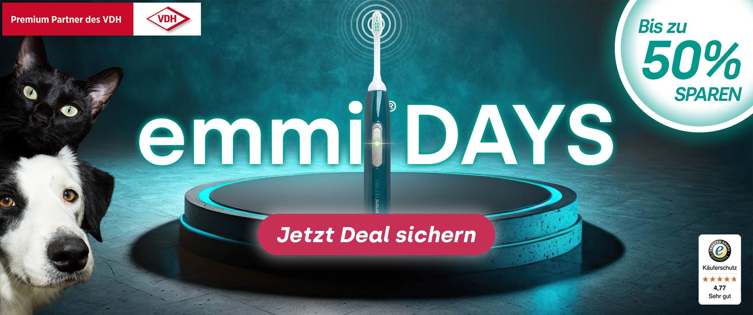 Eine gesunde Mundflora kann sogar das Leben deines Vierbeiners verlängern. Mit der richtigen Zahnpflege-Routine und der emmi-pet Ultraschallzahnbürste für Tiere, kannst Du Zahnstein, Zahnverfärbungen und Zahnfleischentzündungen effektiv vorbeugen.