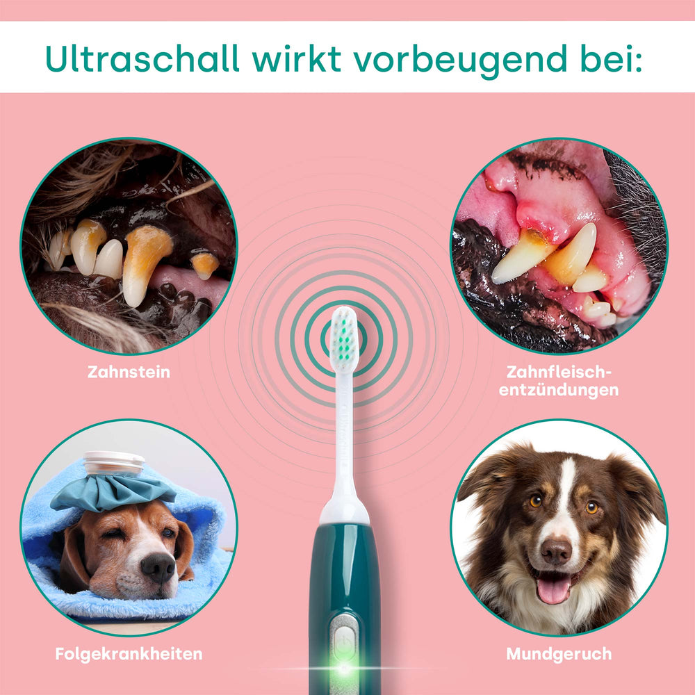 Anders als herkömmliche Bürsten, die auf mechanische Reinigung setzen, nutzt sie die sanfte Kraft des Ultraschalls, um Plaque und Bakterien zu entfernen bzw. reduzieren. Diese innovative Methode ist nicht nur effektiver bei der Vorbeugung von Zahnstein und Zahnfleischerkrankungen, sondern auch sanfter zum Zahnfleisch und den Zähnen deines Hundes. Das macht sie zu einer idealen Wahl für Hunde jeder Größe und jeden Alters, einschließlich empfindlicher oder älterer Tiere, bei denen eine schonende Pflege besonders wichtig ist.