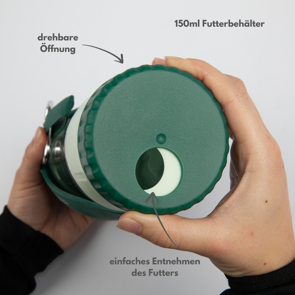 - Integrierter Snack-Behälter: Extra 150 ml für Futter oder Snacks - perfekt für kleine Belohnungen unterwegs.