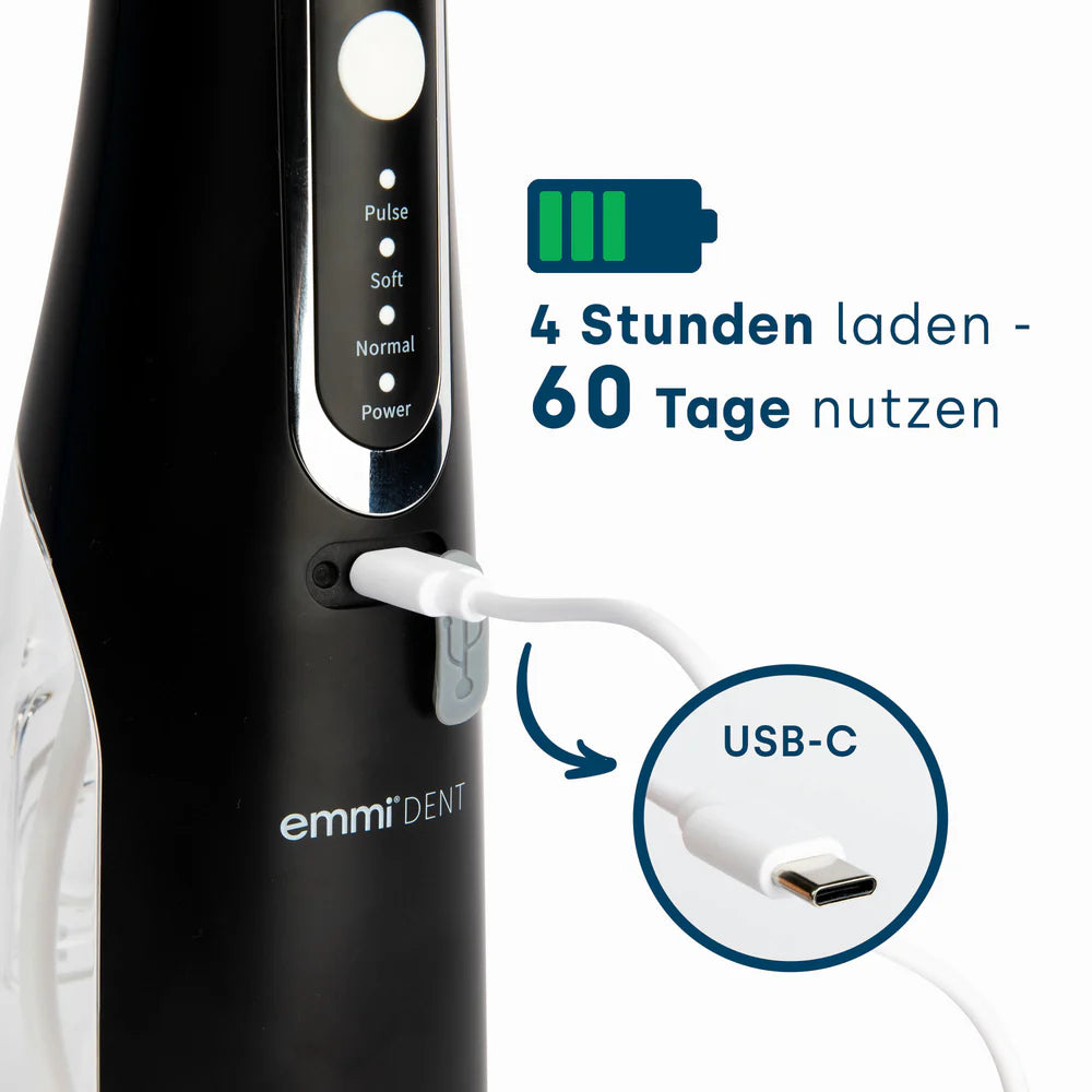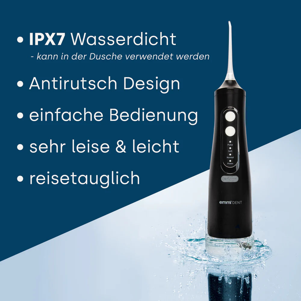 Um Zahnzwischenräumen gründlich und effektiv zu reinigen, reicht Zähne putzen oft allein nicht aus. Speziell für die sanfte Reinigung der Zwischenräume wurde die emmi-dent Munddusche entwickelt. Zum Schutz vor Zahnfleischproblemen - dort wo herkömmliche Zahnbürsten nicht hinkommen. Im Vergleich zur Zahnseide bietet die emmi-dent Munddusche perfekte Reinigung auch bei engstehenden Zähnen oder schlecht erreichbaren Zahnzwischenräumen. Das Gerät besitzt vier Modi: impuls, sanft, normal und stark. Mit den vier mitgelieferten Düsenaufsätzen, haben Sie für jede Reinigung die passende Düse zur Hand. Wir empfehlen, die Düsen alle 3 Monate zu ersetzen.