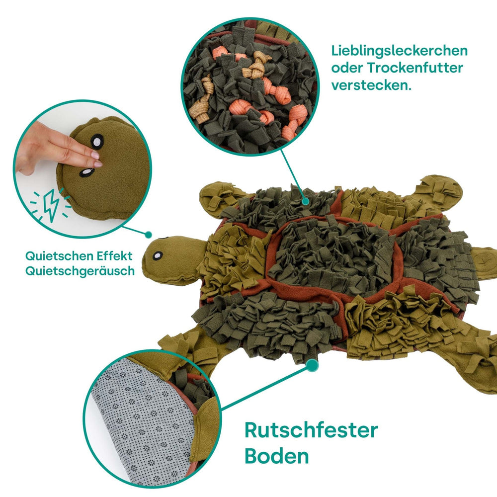 Entdecke die ultimative Beschäftigungsmöglichkeit für deinen Hund mit der emmi-pet Schnüffelmatte Schildkröte! Diese innovative Schnüffelmatte kombiniert Spaß, geistige Stimulation und gesunde Beschäftigung in einem kreativen Design, das wie eine süße Schildkröte aussieht.