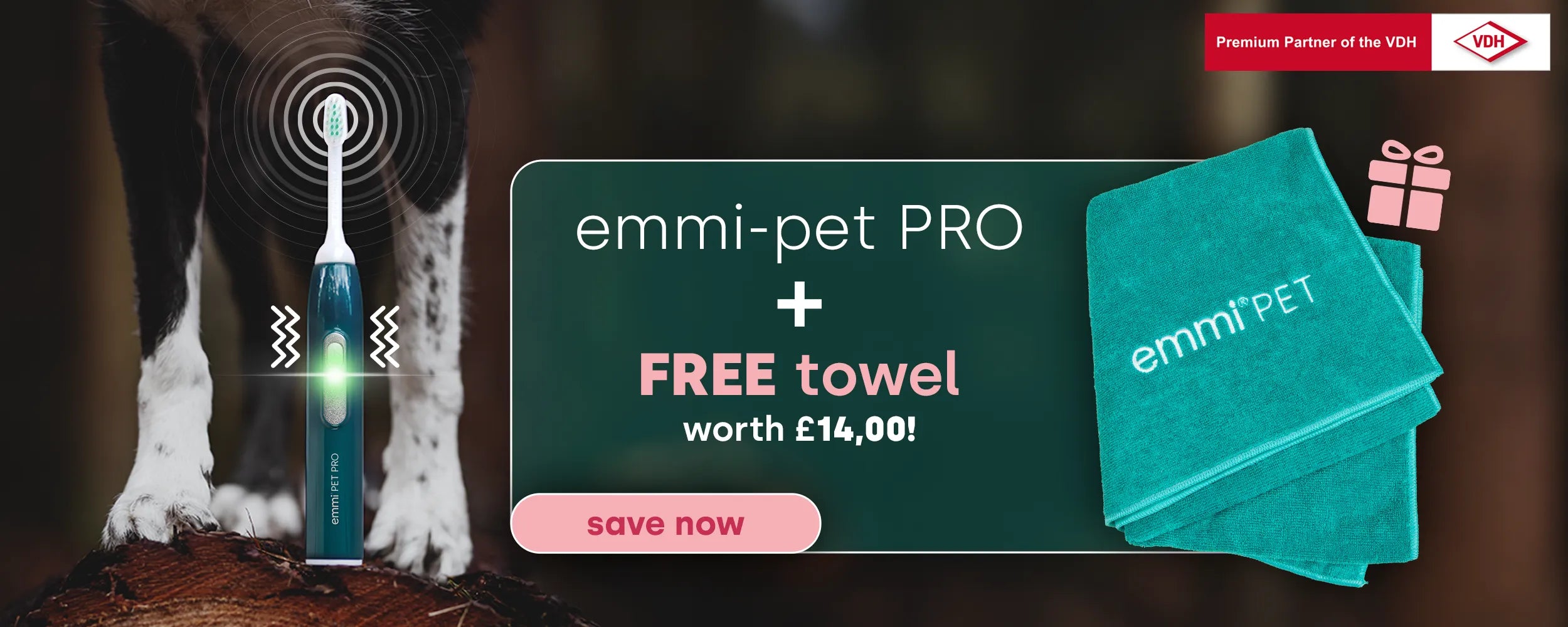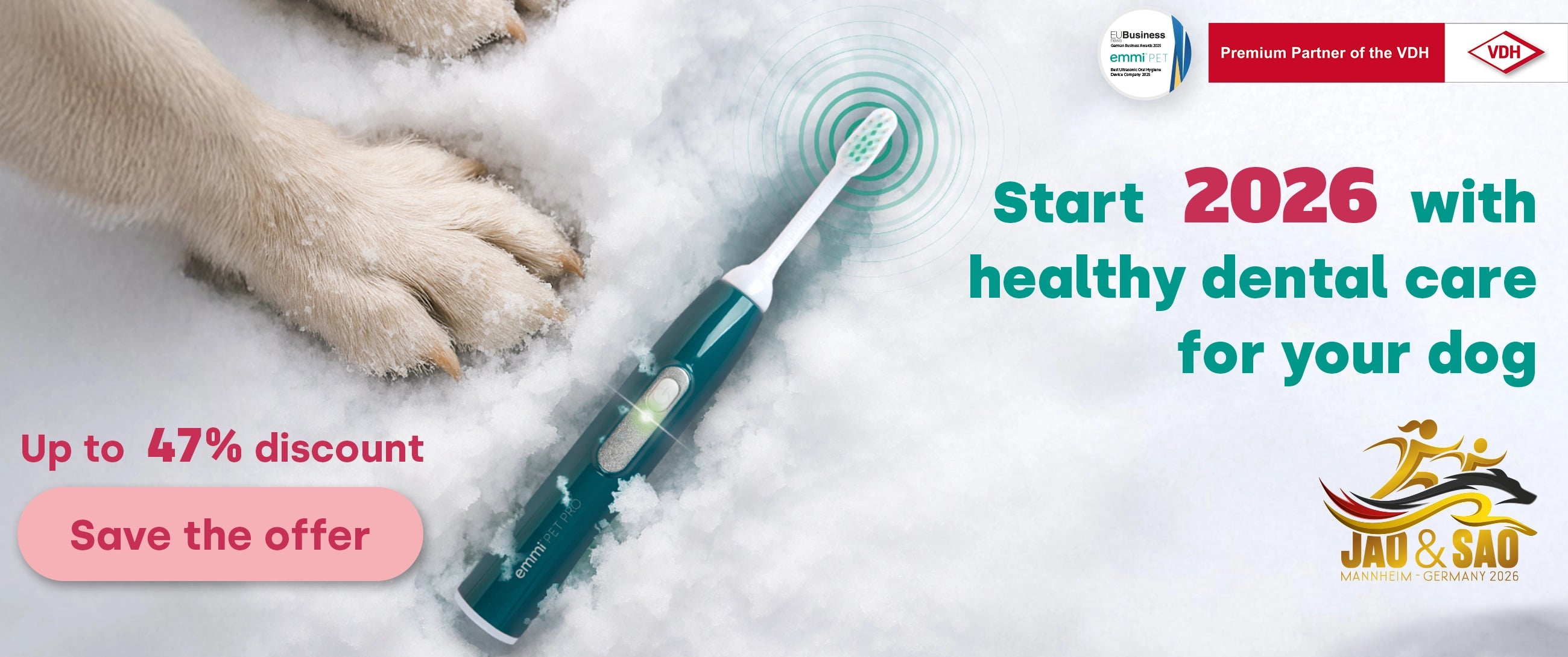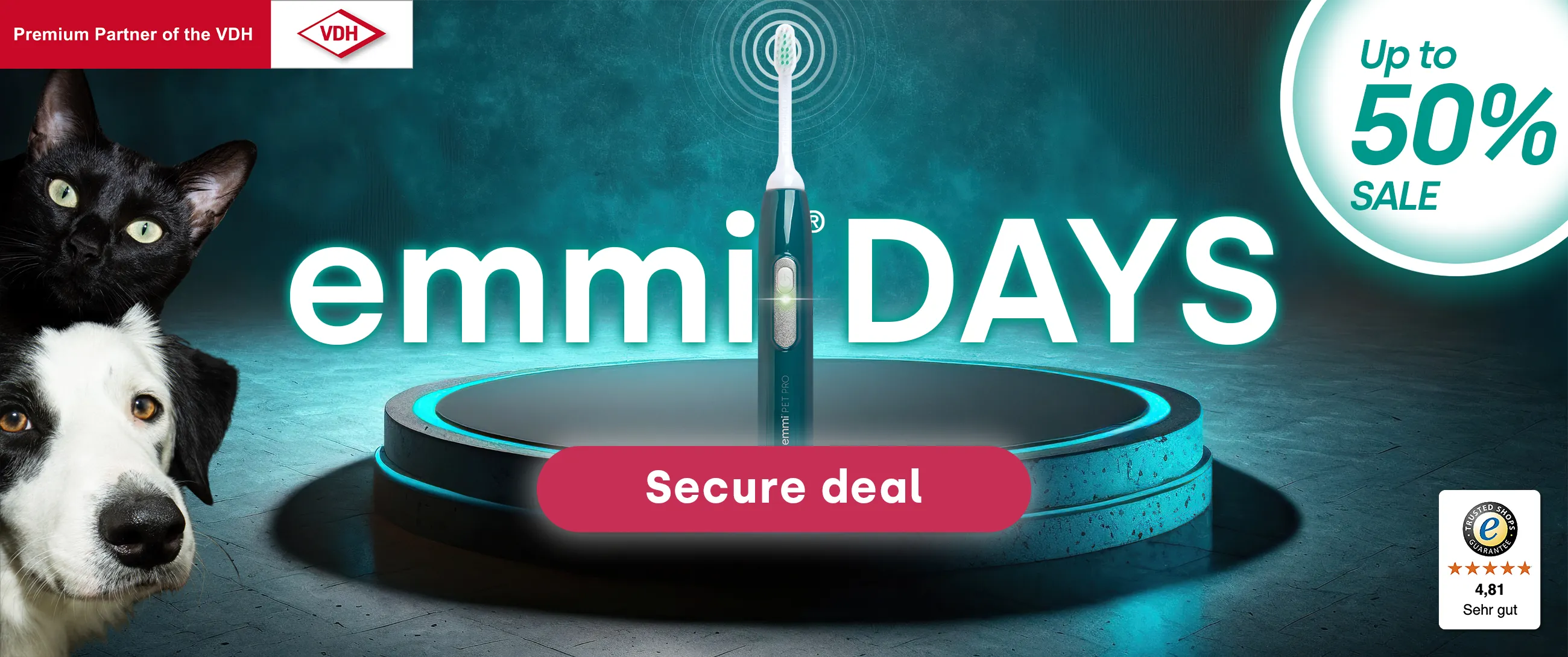 Recomendamos el cepillo de dientes de ultrasonido Emmi-Pet para la limpieza del diente durante elCambio de dientesusarlo incluso con animales muy jóvenes.Esto es particularmente útil para los perros jóvenes, ya que a menudo sufren dolor y las encías se encienden fácilmente cuando cambian.El cepillo de dientes de ultrasonido puede aliviar el dolor y, por lo tanto, facilitar el cambio de diente del animal.Además, el perro se puede usar para el cepillo Emmi-Pet a una edad temprana.La formación Tartar también se combina desde el principio.