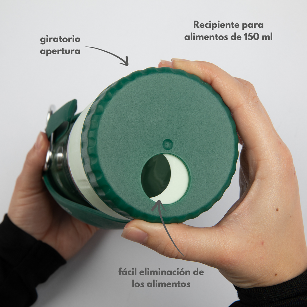 - Atención integral: Agua y snacks en una sola botella: ideal para llevar.