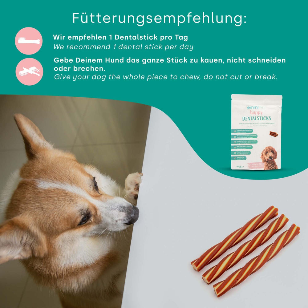 Los palitos pulidores de dientes emmi-pet contienen ingredientes naturales que no solo ofrecen a su perro una experiencia de sabor óptima, sino que también apoyan su cuidado dental. Nuestras barritas masticables son especialmente sabrosas con sabor a piel de pollo y res y proporcionan una gran diversión al masticar mientras limpian entre los dientes y reducen la formación de sarro.