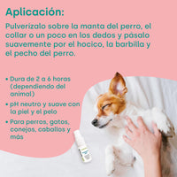 Rociar ligeramente sobre textiles como mantas, transportines, pañuelos o camas – no aplicar directamente sobre el animal.