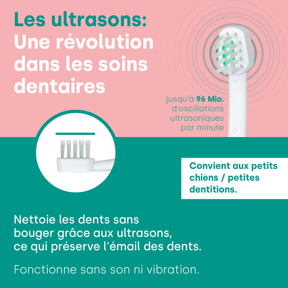 Le emmi-animal de compagnie La tête de brosse à ultrasons tire parti de la technologie ultrasonique brevetée pour atteindre même les zones difficiles à atteindre que les poils conventionnels ont du mal à nettoyer. Grâce à cette technologie révolutionnaire, la plaque dentaire et les impuretés sont éliminées en douceur et efficacement pour favoriser la santé dentaire de votre animal et prévenir d'éventuelles maladies.