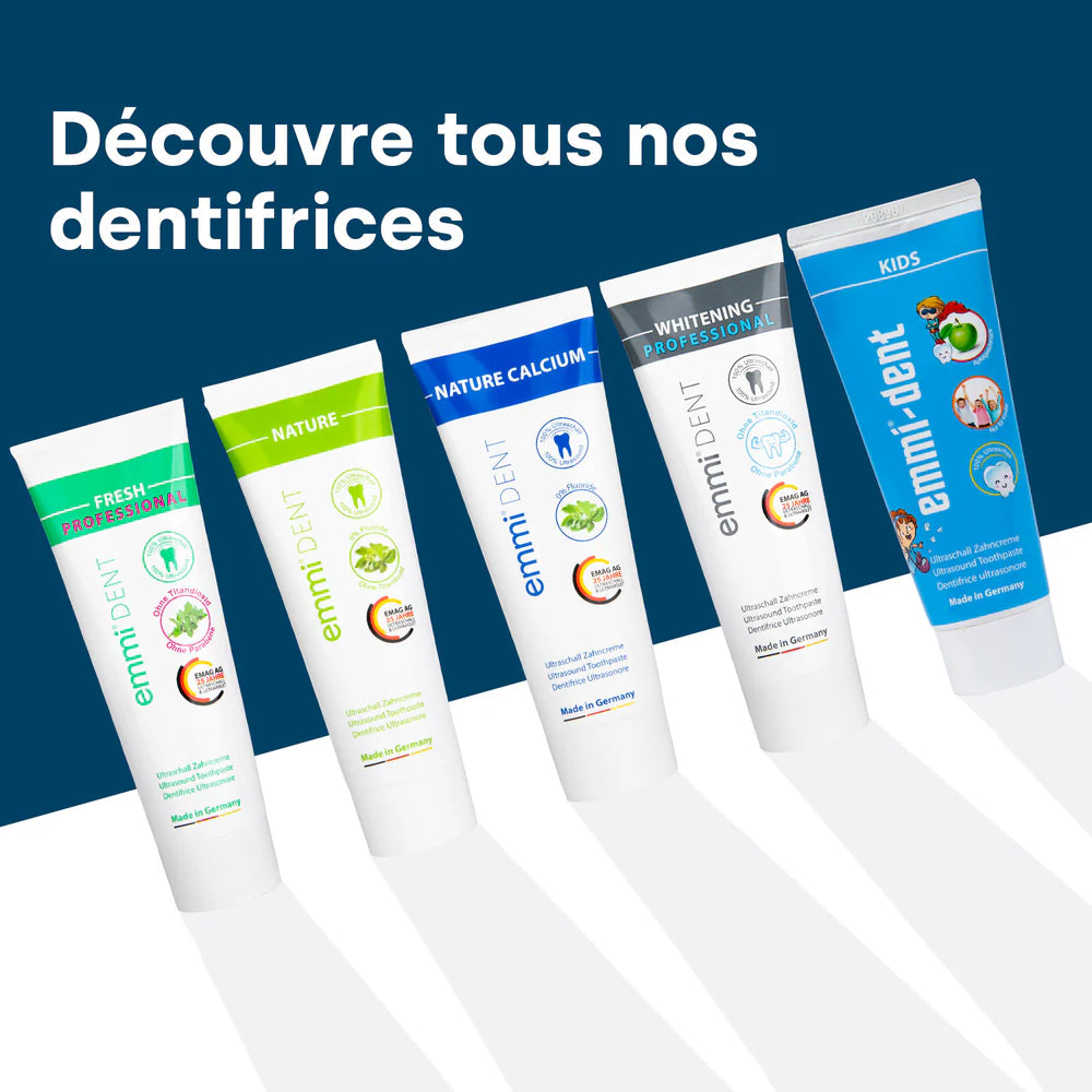 Donnez à vos dents la sensation d'un blanc éclatant avec le révolutionnaire emmi-dent Dentifrice blanchissant à ultrasons. Plongez dans le monde des fonctionnalités et des avantages uniques de emmi-dent Dentifrice blanchissant à ultrasons :