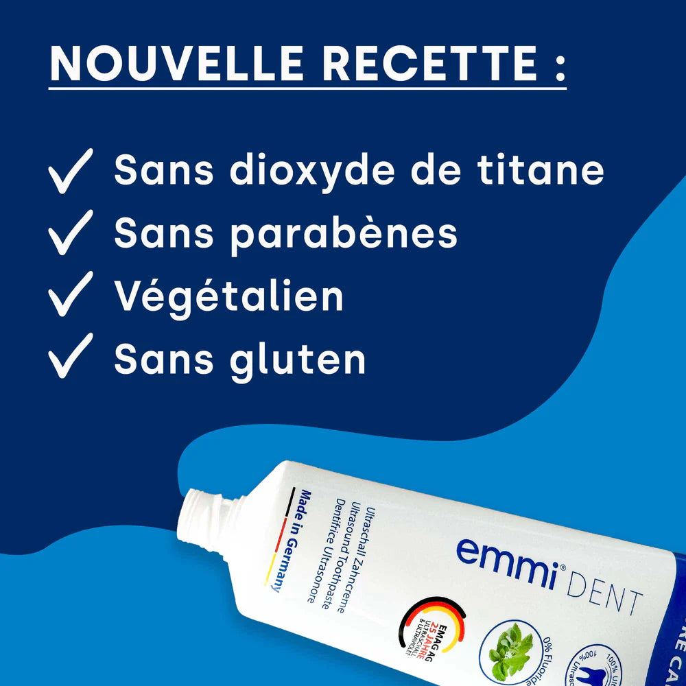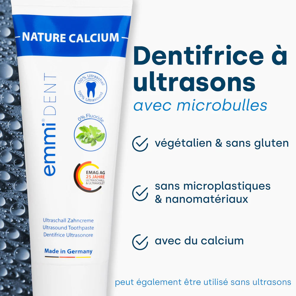 Expérience avec emmi-dent Le dentifrice à ultrasons Nature Calcium est un produit de soin dentaire naturel et sans fluor qui non seulement nettoie en douceur vos dents, mais les renforce également avec du calcium précieux. Cette description de produit vous présente les caractéristiques et avantages exceptionnels de ce dentifrice unique :