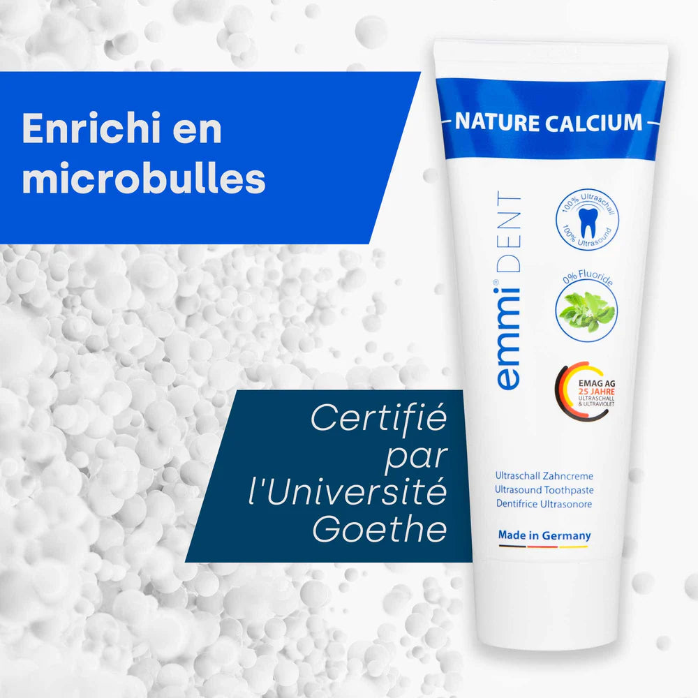 emmi-dent Le dentifrice ultrasonique Nature Calcium contient du calcium de haute qualité qui renforce vos dents et reminéralise l'émail. En renforçant l'émail, vos dents deviennent plus résistantes aux attaques acides et à la carie dentaire. Faites confiance à emmi-dent et donnez à vos dents le renforcement naturel qu'elles méritent.