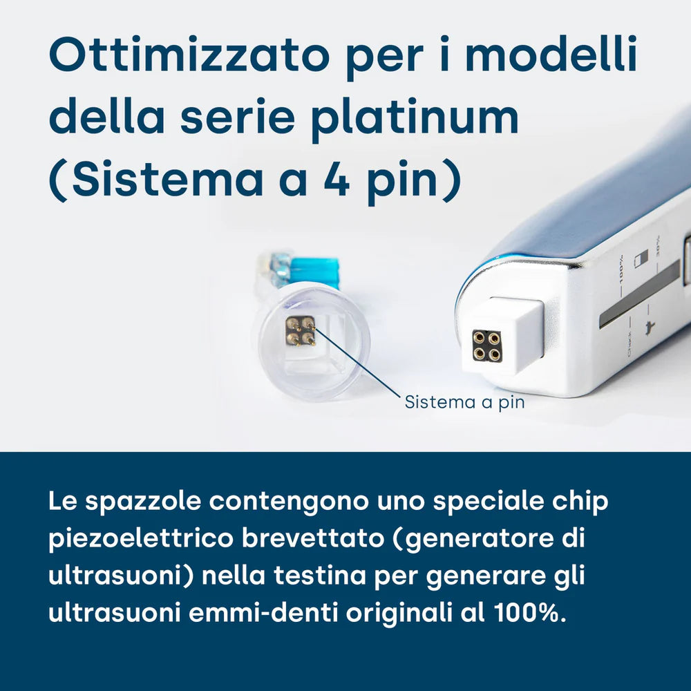 La testina della spazzola ad ultrasuoni del emmi-dent Gli spazzolini ad ultrasuoni contengono uno speciale chip piezoelettrico brevettato (generatore di ultrasuoni) nella testina dello spazzolino per generare il 100% di pulizia originale emmi-dent ultrasuoni. Nelle basi del emmi-dent Le testine Platinum Ultrasonic hanno 4 pin di contatto per la connessione al emmi-dent Cornetta Platinum integrata. Questa innovazione impedisce che si inceppi durante l'inserimento della spina e la testina della spazzola ultrasonica può essere inserita e rimossa facilmente. Inoltre, grazie alla temporizzazione ultrasonica ottimizzata, sono fino a 4 volte più efficaci delle testine degli spazzolini emmi-dent Metallico.