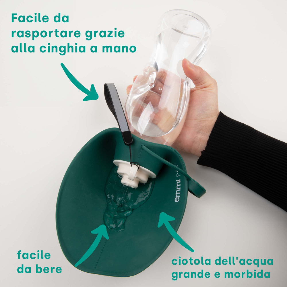 La nostra borraccia da asporto per cani è dotata di un cinturino da polso, che garantisce un trasporto confortevole. La bottiglia è a prova di perdite e si adatta a qualsiasi borsa o zaino. Il coperchio della bottiglia funge anche da ciotola, così il cane può bere direttamente da lì. La borraccia per cani emmi-pet con una capacità di 580 ml è l'accessorio ideale per garantire al tuo cane acqua a sufficienza anche quando è in giro. È leggero, maneggevole e adatto a cani di tutte le taglie.