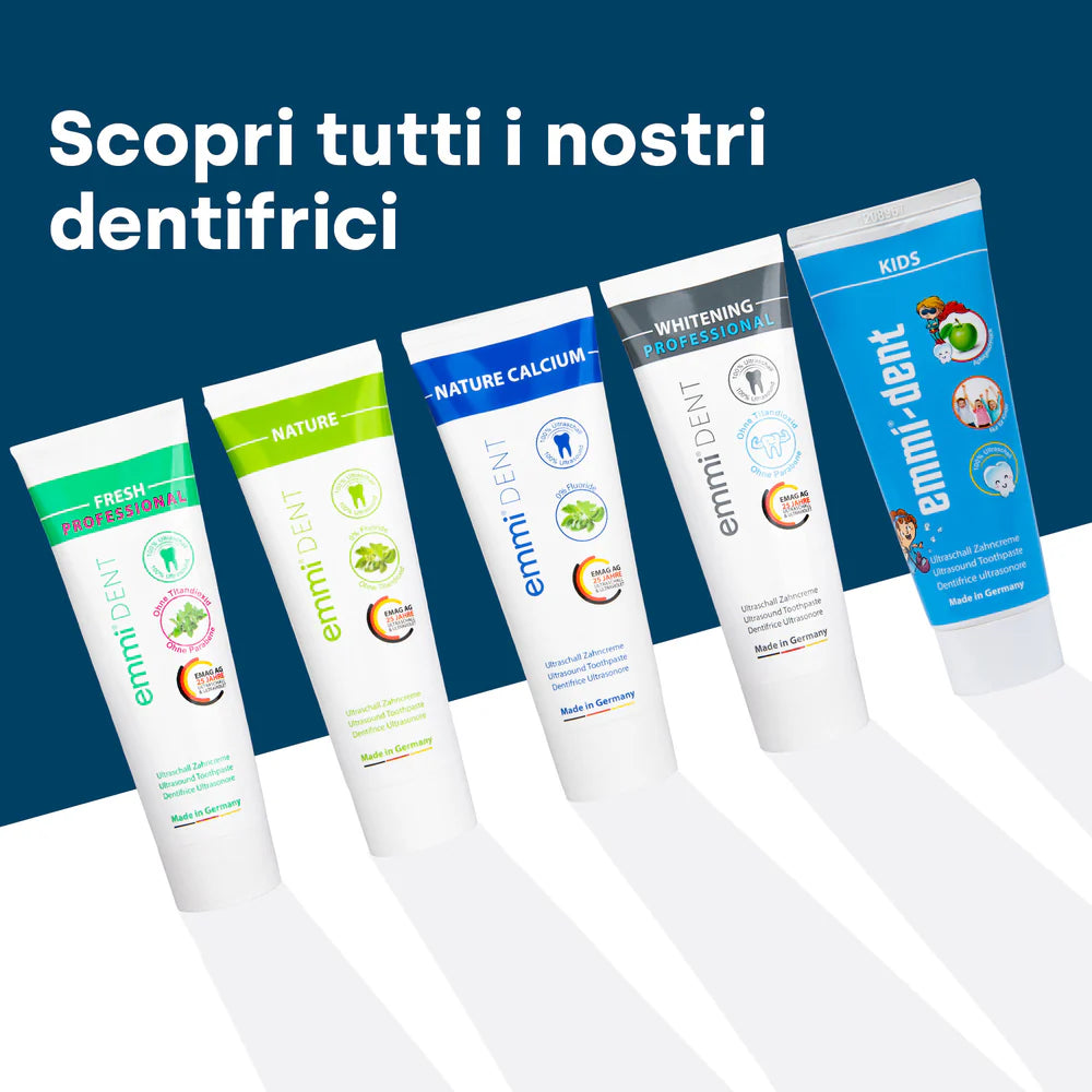 Non aspettare oltre: dai vita al tuo sorriso radioso! Ordina il emmi-dent Acquista subito il dentifricio sbiancante ad ultrasuoni e sperimenta una nuova dimensione della cura dei denti.