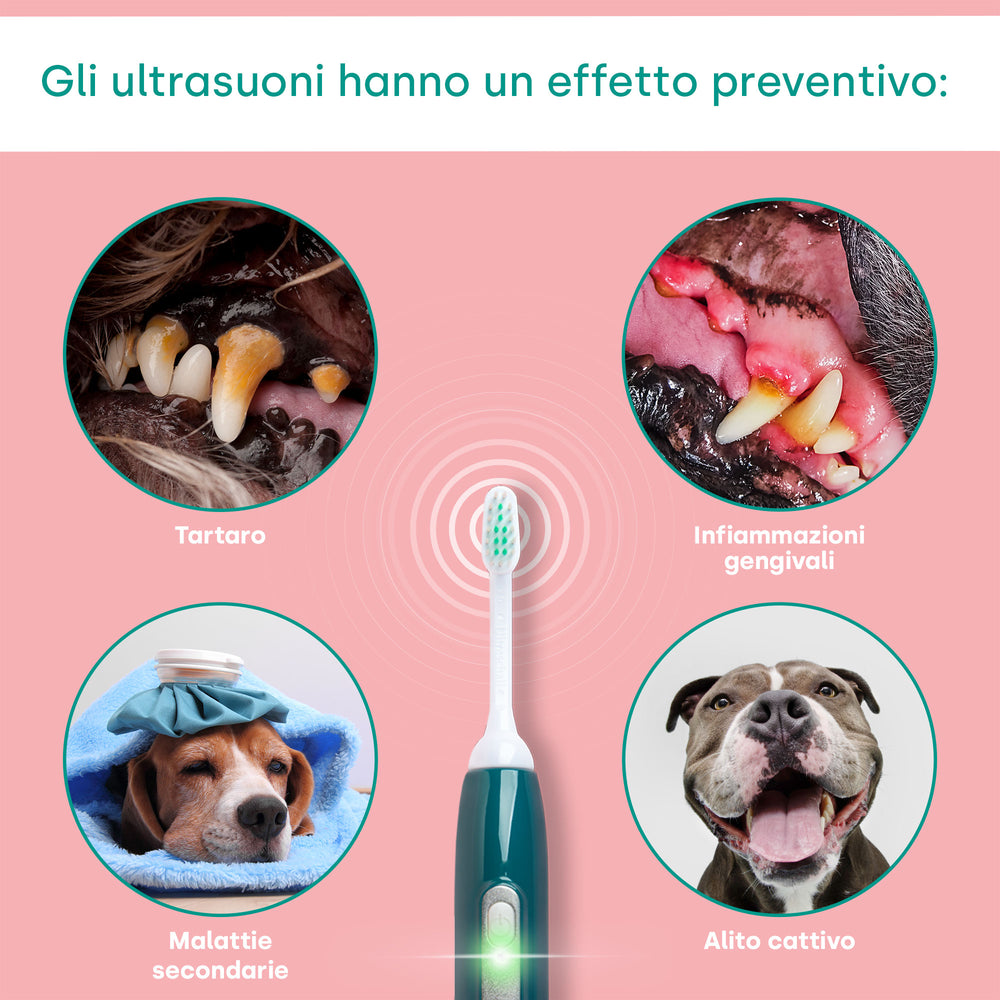 A differenza degli spazzolini tradizionali che si basano sulla pulizia meccanica, questo dispositivo sfrutta la delicata potenza degli ultrasuoni per rimuovere o ridurre placca e batteri. Questo metodo innovativo non solo è più efficace nel prevenire il tartaro e le malattie gengivali, ma è anche più delicato sulle gengive e sui denti del tuo cane. Ciò li rende la scelta ideale per cani di tutte le taglie ed età, compresi quelli sensibili o anziani per i quali è particolarmente importante una cura delicata.