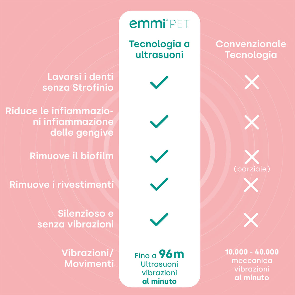 L'esclusiva tecnologia a ultrasuoni dell'emmi-pet 2.0, con fino a 96 milioni di vibrazioni ultrasoniche al minuto, offre un vantaggio significativo rispetto ai metodi di pulizia dei denti convenzionali. Questa innovazione tecnologica consente di ridurre delicatamente la placca e prevenire la formazione del tartaro, proteggendo al contempo le gengive e le zone sensibili della bocca del cane. Le onde ultrasoniche a questa frequenza non sono udibili dal cane, il che rende l'emmi-pet 2.0 particolarmente adatto agli animali.