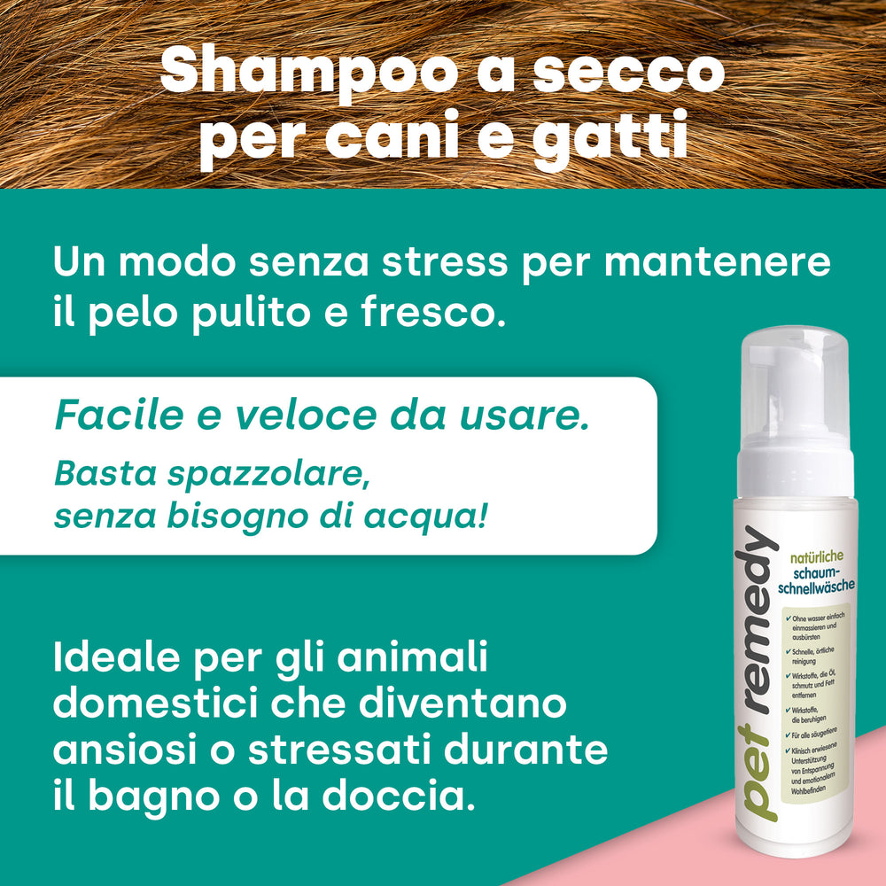 - Senza acqua e senza stress : non è necessario risciacquare, ideale per gli animali che hanno paura dell'acqua.