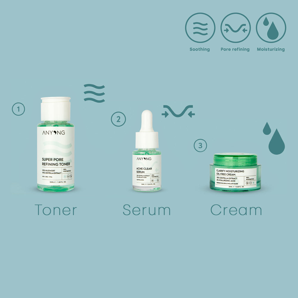 The ideal kit for impure skin. The Pore Refining Toner removes excess oils and thus provides an ideal foreplay. The highlight for clear skin is the Acne Clear Serum, which contains cantella extract and azelaic acid. It reacts specifically to your skin problems and regenerates your skin. The oil-free and clarifying moisturizer is the cosy finishing touch.