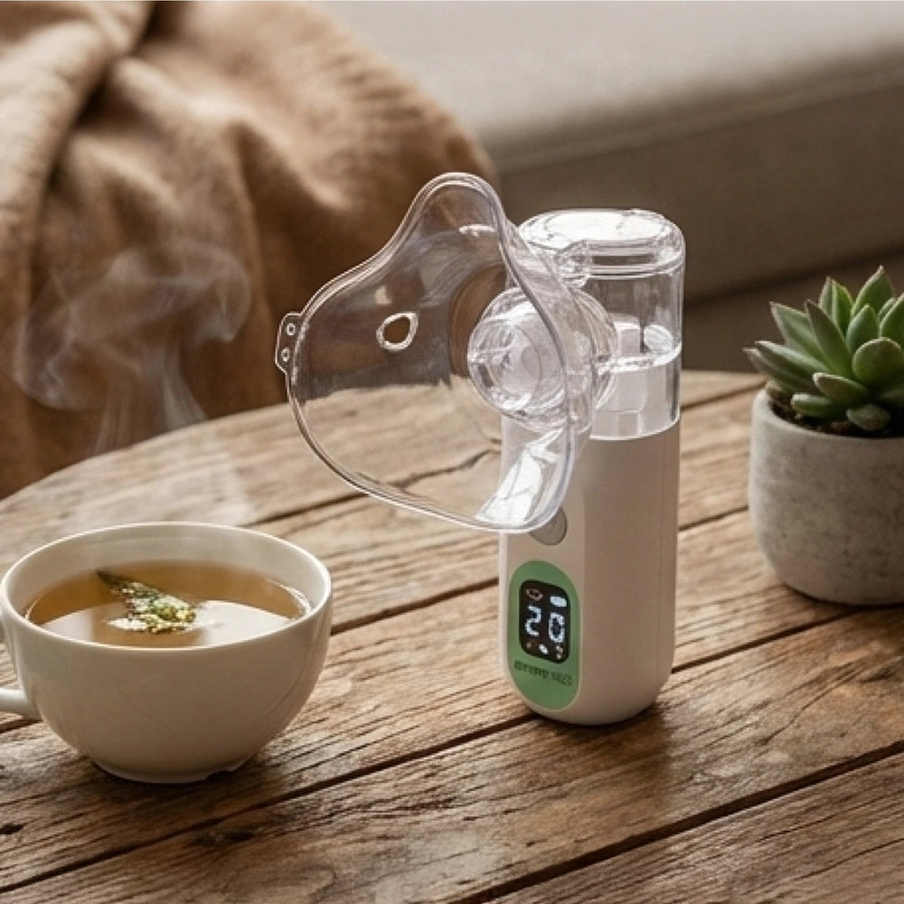 The inhalation device is compact, lightweight (approx. 0.2 kg) and rechargeable – perfect for home, travel or on the go. The easy-to-read super-LCD display clearly shows the operating status.