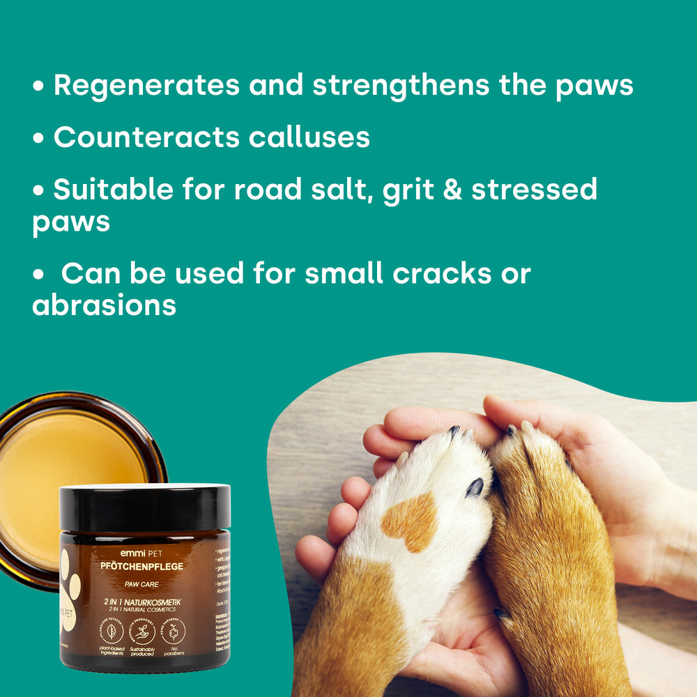 The emmi-pet 2-in-1 Natural Paw Care is the ideal solution for dog owners who value natural, gentle, and effective paw care. Whether in winter with road salt and grit or in summer on hot asphalt, the vegan care balm reliably protects sensitive pads from external irritants.