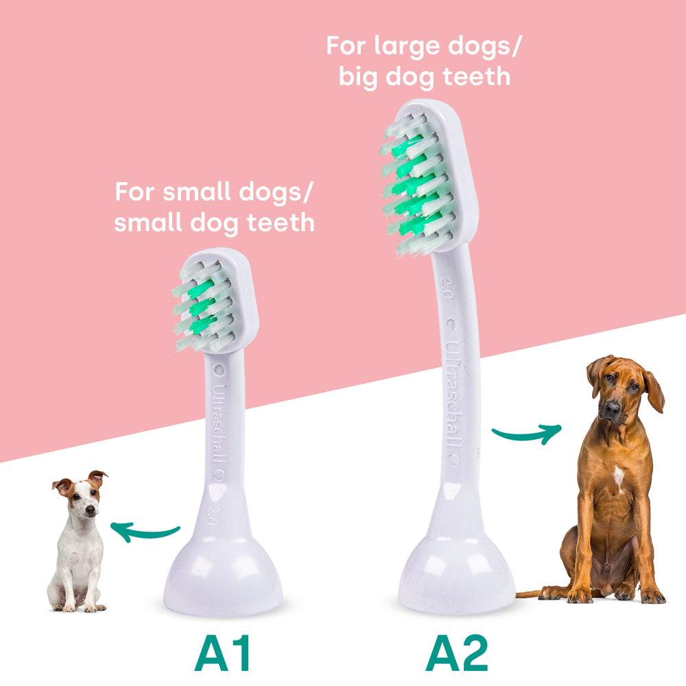 Dog toothbrushes come in various designs. Finger toothbrushes, which are placed over the finger, are particularly suitable for small dogs or for initial training. Dual-head toothbrushes with two different sized brush heads allow for effective cleaning of both large and small teeth. An innovative option is the ultrasonic toothbrush for dogs. This operates silently and without vibration, which can be particularly beneficial for sensitive animals. Ultrasonic technology enables thorough cleaning without mechanical scrubbing.